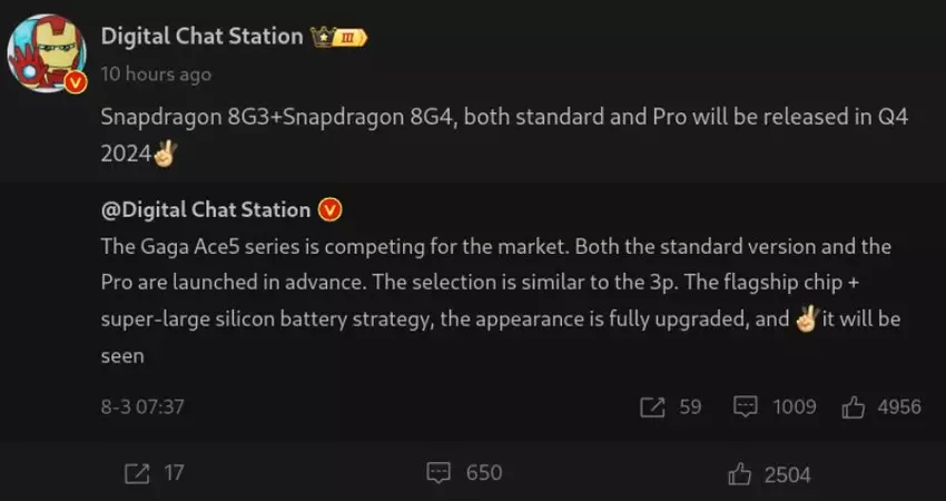 Das Ace 5 wird mit dem Flaggschiff-Prozessor Snapdragon 8 Gen 3 ausgestattet sein, während das Ace 5 Pro den noch nicht angekündigten Snapdragon 8 Gen 4 erhält, der auf dem jährlichen Snapdragon Summit von Qualcomm am 24. Oktober vorgestellt wird. Dies macht eine Serieneinführung im Oktober unwahrscheinlich, so dass die Geräte wahrscheinlich im November oder Dezember auf den Markt kommen werden.