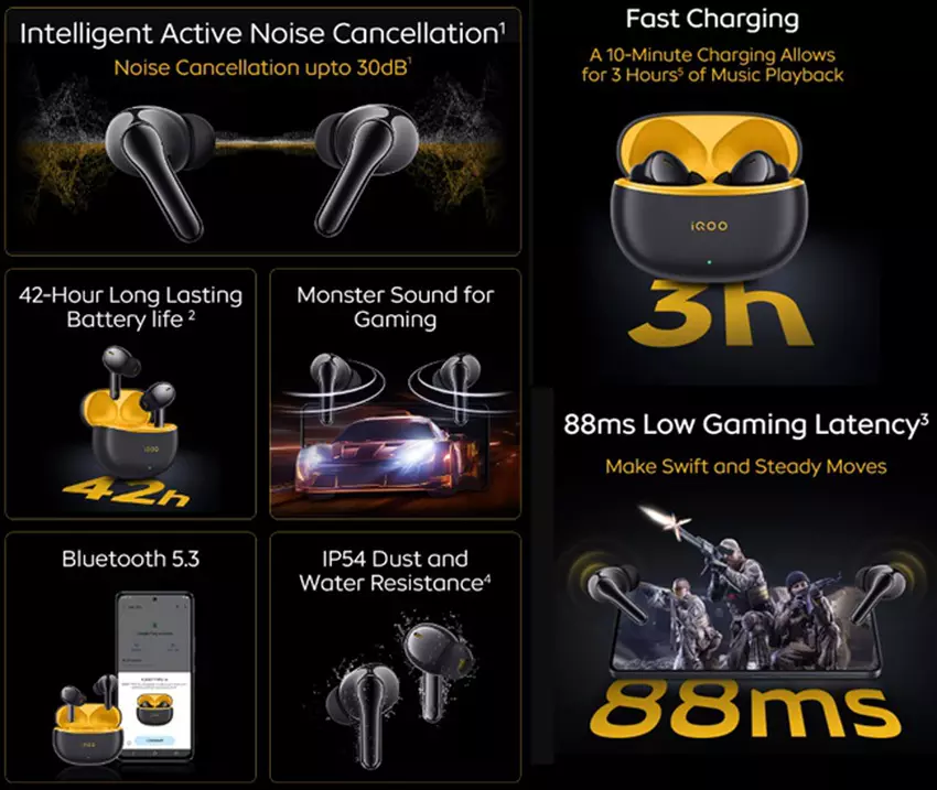 Der Kopfhörer hat ein In-Canal-Design und ein schwarz-gelbes Gehäuse. Das Gerät ist mit Bluetooth 5.3 sowie den Technologien DeepX 3.0 Stereo und 3D Panoramic Audio ausgestattet. Die Neuheit unterstützt aktive Geräuschunterdrückung (bis zu 30 dB) sowie einen Gaming-Modus mit einer Verzögerung von bis zu 88 ms. Mit einer einzigen Ladung hält iQOO TWS 1e mit einer Hülle bis zu 42 Stunden durch. Das Gerät wird über den USB-C-Anschluss aufgeladen.