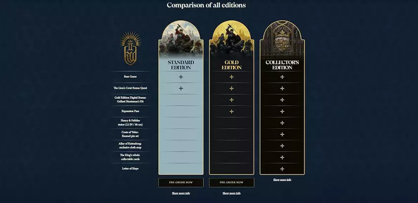 - eine "Gold"-Edition von Kingdom Come: Deliverance 2, die den Zugang zu allen späteren Add-ons (Expansion Pass), die Bonusquest Lionʼs Crest und das Gallant Huntsmanʼs Kit im Spiel enthält;