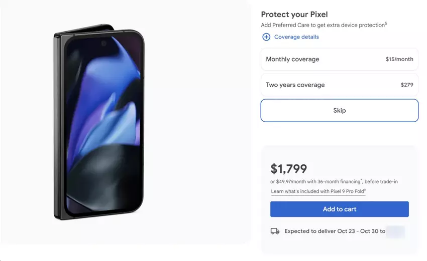 Der Google Store nimmt nun wieder Bestellungen für das Pixel 9 Pro Fold in beiden verfügbaren Farben an. Der voraussichtliche Liefertermin für Bestellungen an die Testadresse in North Carolina liegt zwischen dem 23. und 30. Oktober.