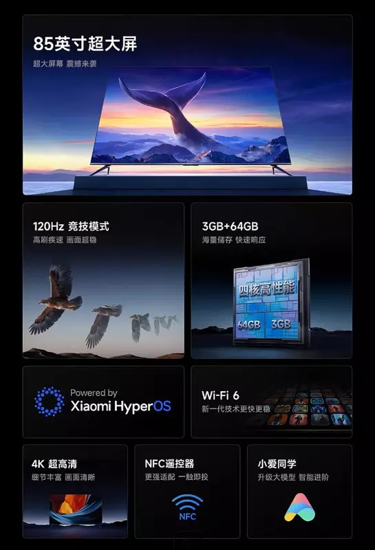 Redmi Max TV 85 (2025) kommt mit 3 GB RAM und 64 GB Speicher. Die Neuheit wird von einem Quad-Core-Prozessor angetrieben. Das Gerät verfügt über Wi-Fi 6, Bluetooth 5.2 und NFC. Der Fernseher verfügt über das Out-of-the-Box-Betriebssystem HyperOS mit Sprachassistent Xiao Ai