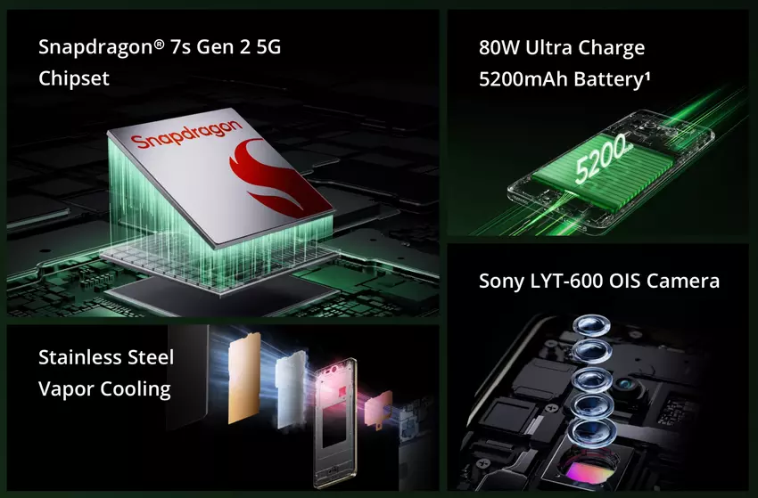 Angetrieben wird das Smartphone von einem Octa-Core Qualcomm Snapdragon 7s Gen 2 Prozessor gepaart mit 8/12GB RAM (LPDDR4x) und 128/256/512GB ROM (UFS 3.1). Die Neuheit wird von einem 5200mAh-Akku mit 80W Ladeleistung angetrieben. Das Gerät verfügt über ein Kühlsystem und einen IP65-Wasserschutz sowie über Rainwater Touch, mit dem man den Bildschirm auch mit nassen Fingern bedienen kann.