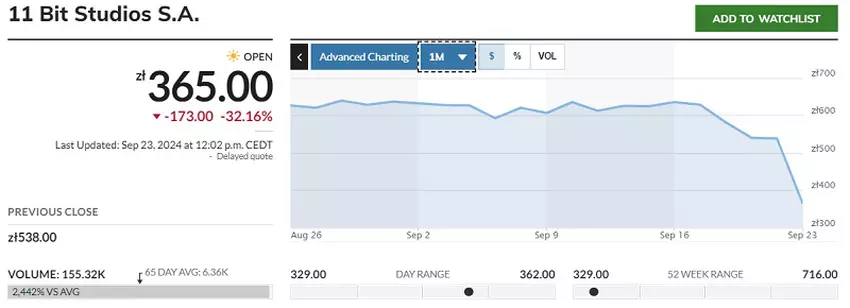 Und in nur drei Tagen ist der Wert der 11 Bit-Aktien an der Warschauer Börse ohne Übertreibung zusammengebrochen! Noch vor wenigen Tagen lag der Kurs bei 645 Zloty (168 $), heute liegt er bei 365 Zloty (95 $) und fällt weiter. In fünf Tagen ist der Aktienkurs um 42 % gefallen!