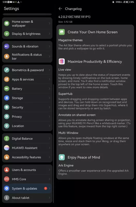 Mit der neuen Softwareversion erhält das Huawei MatePad Air ein adaptives Art Star UI-Theme, verbesserte SuperHub-Funktionen, eine aktualisierte Ark Engine mit verbesserter UI und Animationen sowie einen neuen Sicherheitspatch und mehr.