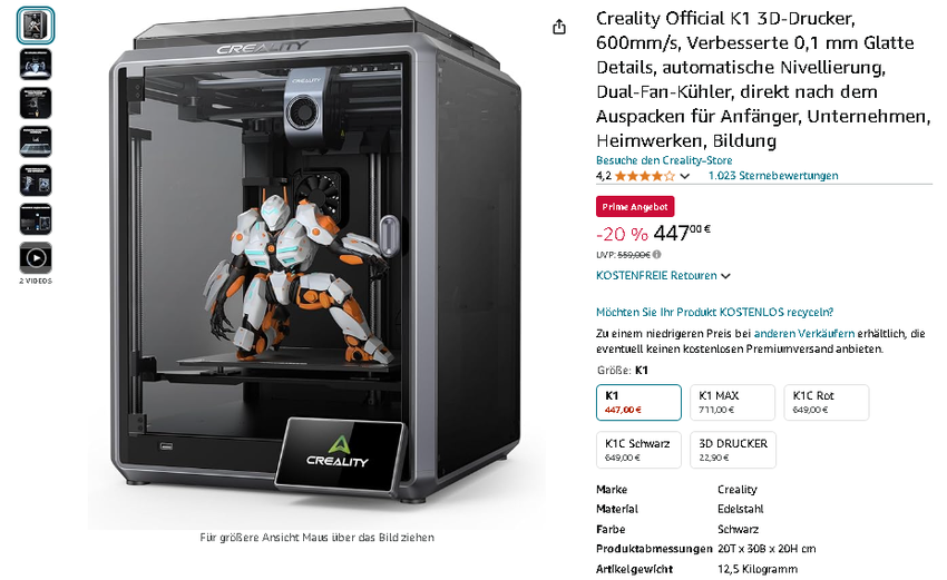Greifen Sie jetzt zu: Creality K1 3D-Drucker zu einem Sonderpreis auf Amazon.de