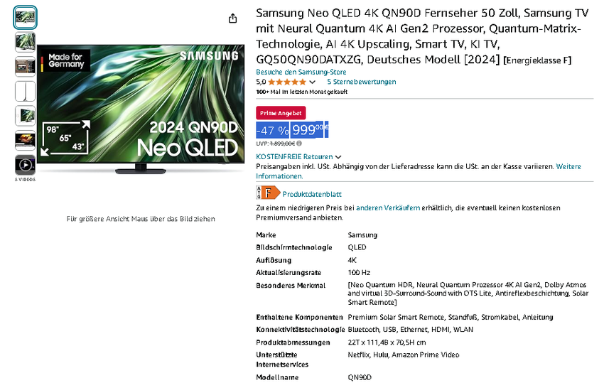 Der Samsung Neo QLED 4K QN90D ist aktuell für 999,00 € erhältlich, reduziert von 1.899,00 € - das entspricht einem sensationellen Rabatt von 47%! Ein Preis, der dieses Hightech-Wunderwerk in greifbare Nähe rückt.