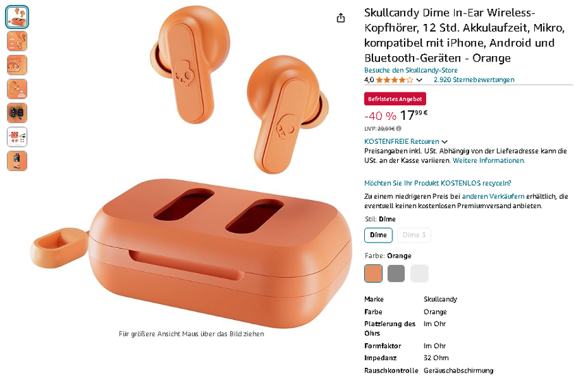 Das vielseitige Skullcandy Dime True Wireless Earbuds ist aktuell für 17,99 € erhältlich, reduziert von 29,99 € - das entspricht einem sagenhaften Rabatt von 40%!