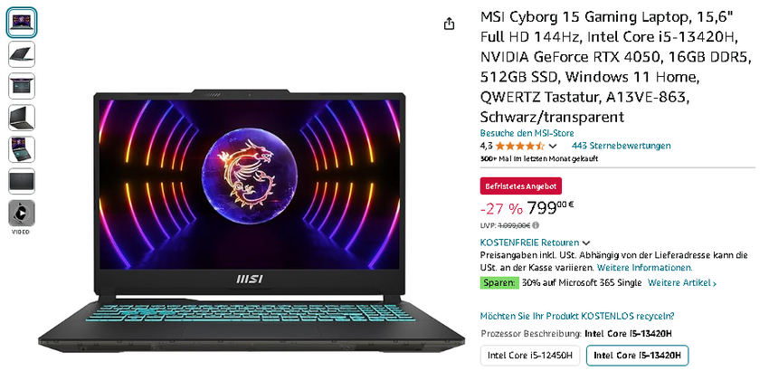 Der MSI Cyborg 15 Gaming Laptop ist jetzt für 799,00 € erhältlich, reduziert von 1.099,00 € - das sind satte 27% Rabatt! Ein Angebot, das selbst Netrunner staunen lässt.