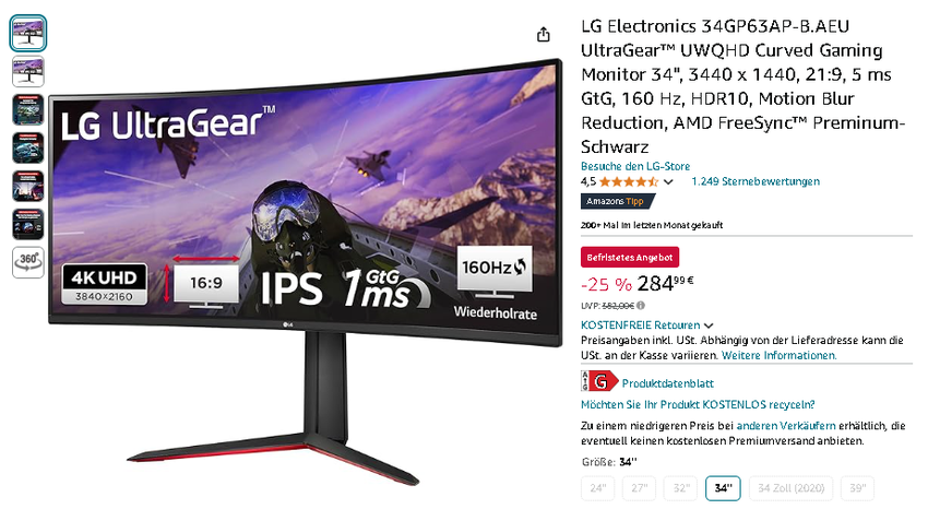 Der LG 34GP63AP-B Gaming-Monitor ist jetzt für 284,99 € erhältlich, reduziert von 382,00 € - das sind satte 25% Rabatt! Ein Angebot, das Ihre Augen zum Leuchten und Ihr Spielerherz zum Rasen bringen wird.
