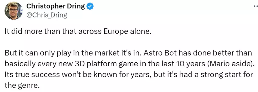 Der Chefredakteur von GamesIndustry.biz, Christopher Dring, sprach mit Abonnenten der X und verriet, dass die Verkaufszahlen von Astro Bot die Erwartungen von Sony und Analysten übertroffen haben. Er stellte fest, dass, obwohl der wirkliche Erfolg des Spiels kann noch nicht bewertet werden, weil es zu wenig Zeit nach der Veröffentlichung gewesen, aber es ist bereits sicher zu sagen, dass die neue PlayStation 5 exklusive zweite in der Popularität unter den modernen Plattformern nur Konsole exklusiv Nintendo - Spiele unsterblichen Reihe von Mario ist.
