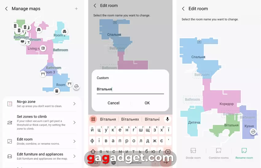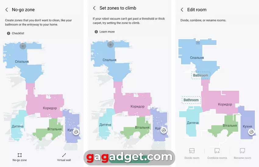Neben Möbeln oder Geräten können Sie der Karte auch virtuelle Grenzen oder No-Go-Zonen hinzufügen. Fügen Sie die Platzierung von Teppichen mit Flor hinzu (die App enthält separate Anweisungen für den Roboter, wie er Bereiche mit Teppichen reinigen soll). Und die triviale Möglichkeit, Räume zu bearbeiten - erkannte Zonen zu einem Raum zusammenfassen oder umgekehrt eine Zone in zwei verschiedene aufteilen. Und natürlich die Möglichkeit, diese Räume nach Belieben umzubenennen.