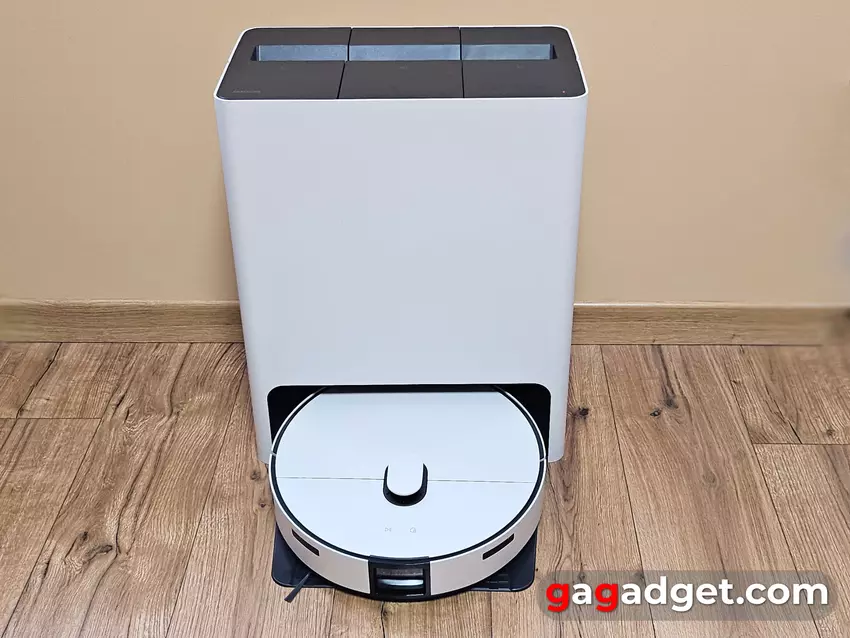 In der Tat war ich mit der Trockenreinigung zufrieden - im Modus der täglichen Reinigung meistert der Staubsaugerroboter die Aufgabe der Sauberkeitserhaltung wirklich cool. Er macht alles selbst - er fährt hin und her, lädt sich bei Bedarf auf und leert automatisch den Mülleimer an der Station. In einem solchen Modus kann er mehrere Wochen lang ohne Zutun des Benutzers arbeiten (und dann muss der Staubbeutel der Reinigungsstation gewechselt werden, aber das hängt von den spezifischen Arbeitsbedingungen ab).