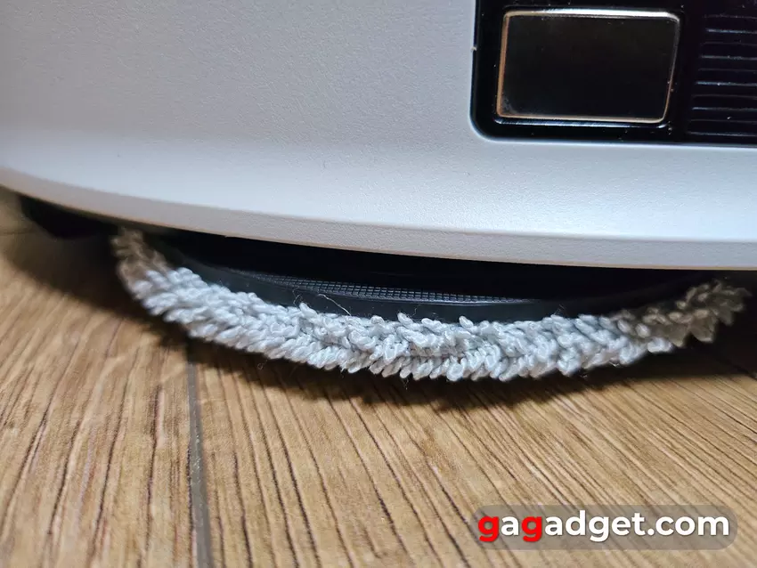 Außerdem gibt es zwei abnehmbare Serviettenaufsätze, die mit Klettverschluss befestigt werden. Und eine abnehmbare Walze mit einer Hauptbürste und einem Aufsatz. Die beiden Schlitze zwischen dem Schwenkrad sind Höhenunterschiedssensoren, die verhindern, dass der Roboter in großen Häusern die Treppe hinunterfällt. Rechts daneben, neben dem Batteriefach, befindet sich ein Teppicherkennungssensor. Er lässt den Roboter erkennen, dass sich ein Teppich darunter befindet, so dass er die nassen Reinigungstücher aufnehmen muss, wenn dies in den Einstellungen angegeben ist (mehr dazu weiter unten).
