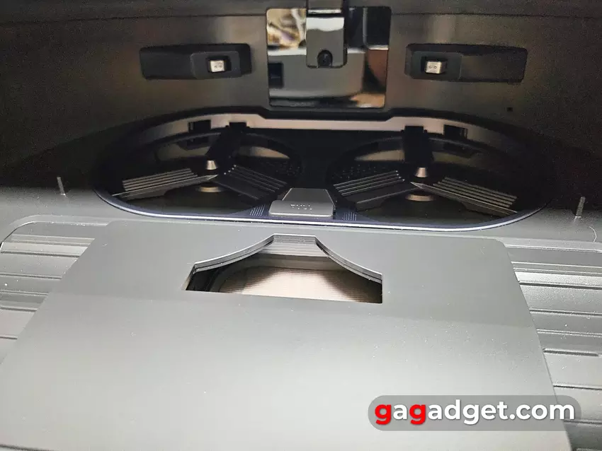 Auf der Rückseite der Station befindet sich ein Element für die Verwaltung von zusätzlichen Kabeln (ich habe zum Beispiel Steckdosen für einen Staubsaugerroboter neben der Station, daher braucht er eine gewisse Länge). Auf der linken Seite unter der Abdeckung befindet sich ein Feinstaubfilter(HEPA). Der Hersteller gibt an, dass er 99,999 % (so viel) des Staubs auffängt, was für Allergiker sehr wichtig ist. In der Mitte befindet sich außerdem ein Tragegriff - Sie werden die Station wohl kaum mit sich herumschleppen, aber der Komfort ist nicht überflüssig.