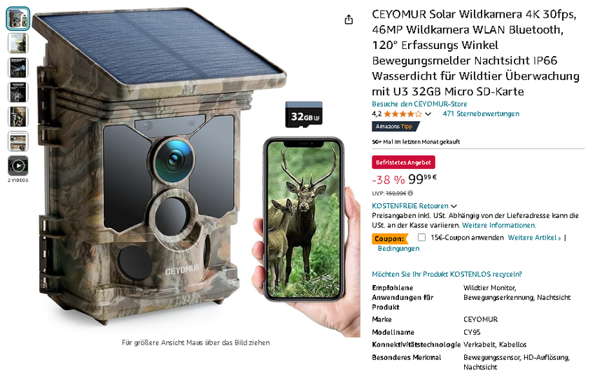 Die CEYOMUR Solar Wildkamera ist derzeit für 99,99€ erhältlich, reduziert von 159,99€ - das entspricht einem Rabatt von 38%! Ein Angebot, das Naturliebhaber und Wildtierbeobachter begeistern wird.