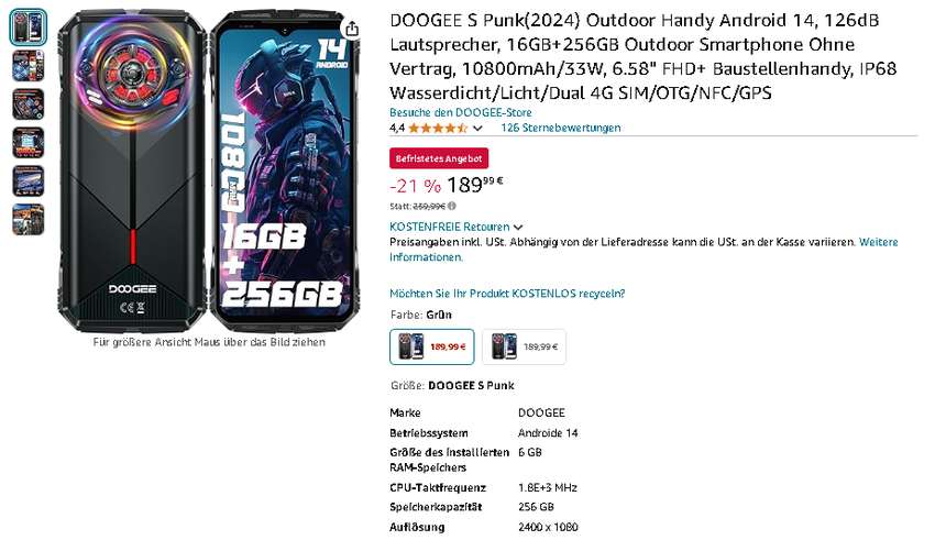 Das DOOGEE S Punk (2024) Smartphone ist aktuell für 189,99 € verfügbar, reduziert von 239,99 € - das entspricht einer Ersparnis von 50 €! Ein Angebot, das Sie sich nicht entgehen lassen sollten.