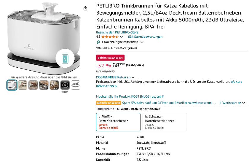 Der PETLIBRO Kabellose Trinkbrunnen für Katzen ist aktuell für 68,99 € erhältlich, reduziert vom UVP von 109,99 € - das entspricht einer Ersparnis von 41 €! Ein Angebot, das Katzenliebhaber nicht verpassen sollten.