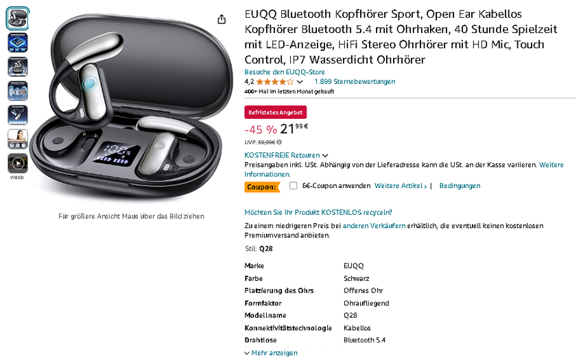 Greifen Sie zu: EUQQ Sport-Kopfhörer zum Vorteilspreis auf Amazon.de