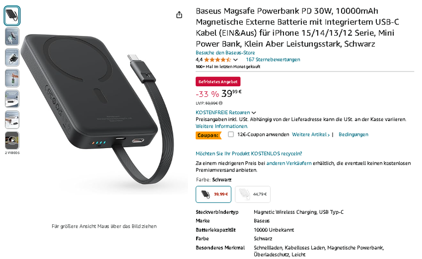 Die Baseus Magsafe Powerbank ist aktuell für 39,99 € erhältlich, reduziert vom UVP von 59,99 € - das entspricht einer Ersparnis von 20 €! Ein Angebot, das Smartphone-Nutzer begeistern wird.