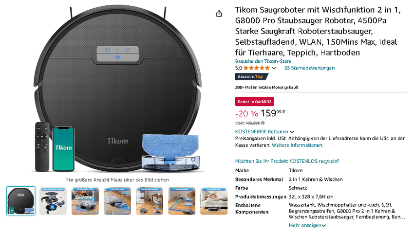 Der innovative Tikom G8000 Pro Staubsauger Roboter ist aktuell für 159,99 € erhältlich, reduziert von 199,99 € - das entspricht einer Ersparnis von 20%! Ein Angebot, das Ihren Geldbeutel und Ihre Böden gleichermaßen schont.