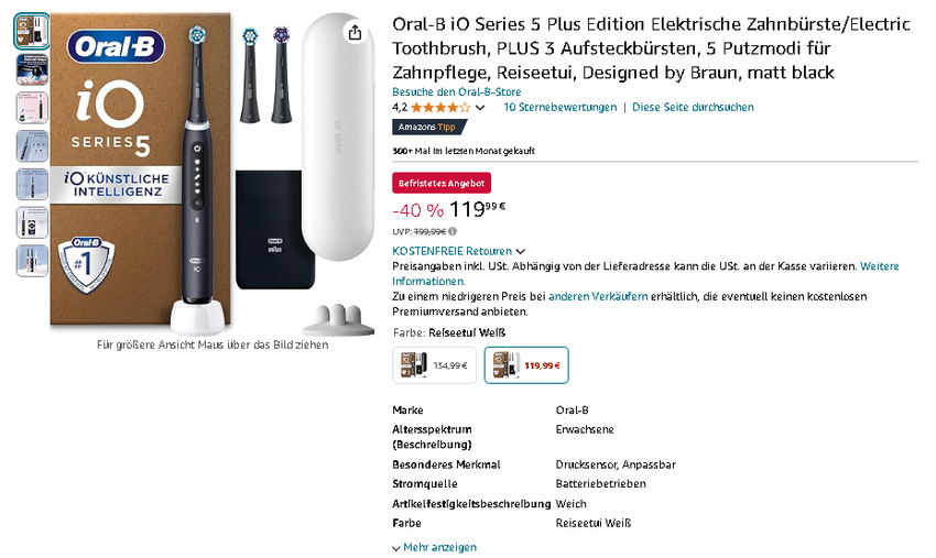 Die Oral-B iO Series 5 Plus Edition ist momentan für nur 119,99 € erhältlich, reduziert von 199,99 € - das entspricht einer beachtlichen Ersparnis von 40%. Ein Angebot, das Zahnpflege-Enthusiasten nicht verpassen sollten.