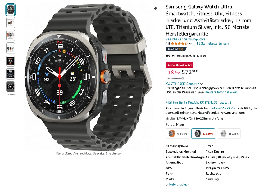 Mit ihrer Kombination aus Premium-Design, fortschrittlicher Technologie und dem aktuellen Preisnachlass stellt die Samsung Galaxy Watch Ultra eine außergewöhnliche Gelegenheit dar. Ob für intensives Training, Outdoor-Abenteuer oder den anspruchsvollen Alltag - diese Smartwatch verspricht Spitzenleistung und Zuverlässigkeit zu einem attraktiven Preis. Nutzen Sie diese Chance, solange das Angebot noch gültig ist, und heben Sie Ihr Fitness-Tracking und Ihre tägliche Produktivität auf ein neues Level!
