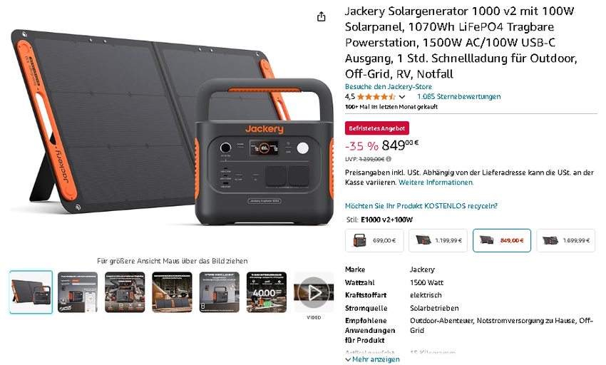 Der Jackery 1000 v2 ist heute für 849,00 € erhältlich, statt 1.299,00 € - eine beeindruckende Ersparnis von 35%!