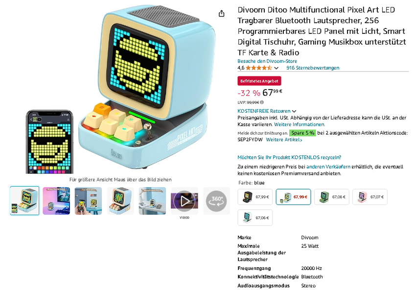 Der Divoom Ditoo ist aktuell für 67,99 € verfügbar, statt 99,99 € - das bedeutet 32% Ersparnis!