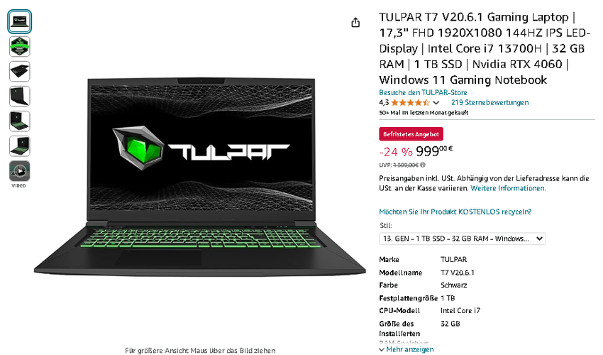Der TULPAR T7 V20.6.1 ist aktuell für nur 999,00 € statt 1.309,00 € verfügbar - das bedeutet eine Ersparnis von 24%! Eine verlockende Gelegenheit für alle, die von einem leistungsstarken Gaming-Laptop träumen.