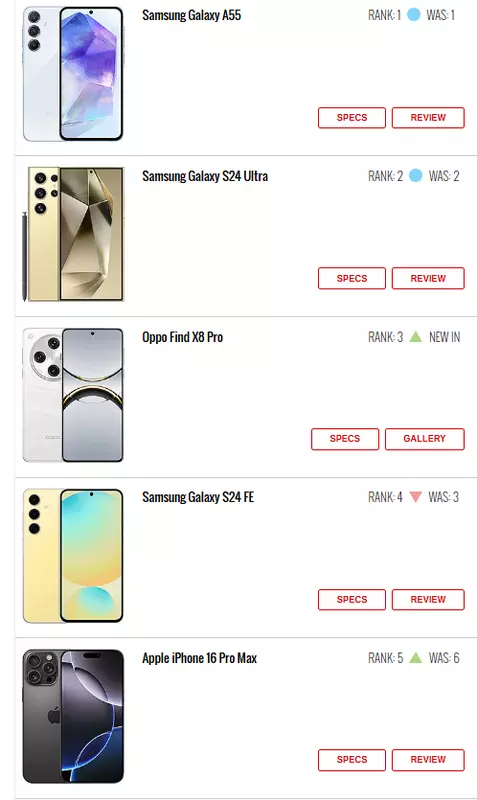 Das Galaxy A55 hat Flaggschiff-Modelle wie das Galaxy S24 Ultra und das kürzlich vorgestellte Oppo Find X8 Pro überholt und den zweiten bzw. dritten Platz eingenommen. Das kürzlich vorgestellte Galaxy S24 FE liegt auf dem vierten Platz, während das neue iPhone 16 Pro Max auf Platz 5 der beliebtesten Smartphones liegt.