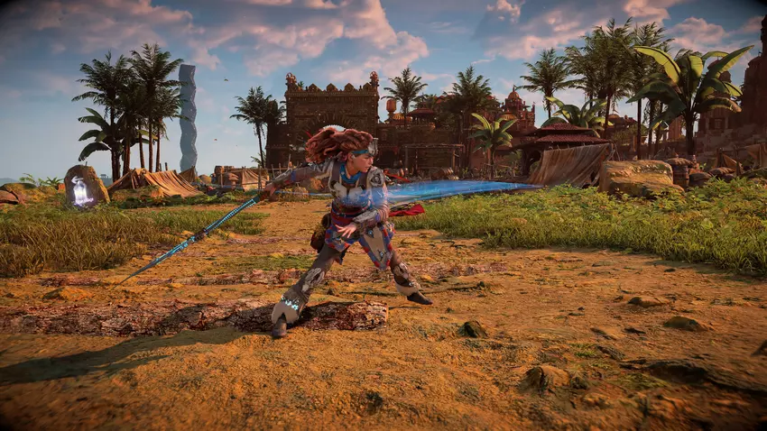 - Speer: Die wichtigste Nahkampfwaffe, die Aloy benutzt, um schnelle Schläge auszuführen. Zusätzlich zu den normalen Schlägen kann der Speer verwendet werden, um Maschinen abzufangen, was Ihnen die Möglichkeit gibt, sie als Transportmittel zu steuern, um sich in der Welt zu bewegen (z. B. Robo-Pferd).