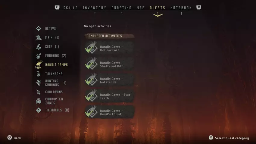 Banditenlager sind über die ganze Welt verstreut und sind Zufluchtsorte für Feinde, die die lokale Bevölkerung terrorisieren. Aloy kann diese Lager räumen, die Feinde vernichten und so die Sicherheit in einer bestimmten Region gewährleisten.