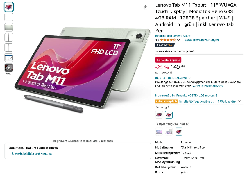 Das Lenovo Tab M11 ist aktuell für 149,00 € statt 199,00 € erhältlich - ein attraktiver Rabatt von 25%. Ein fantastisches Angebot für ein Tablet dieser Klasse!