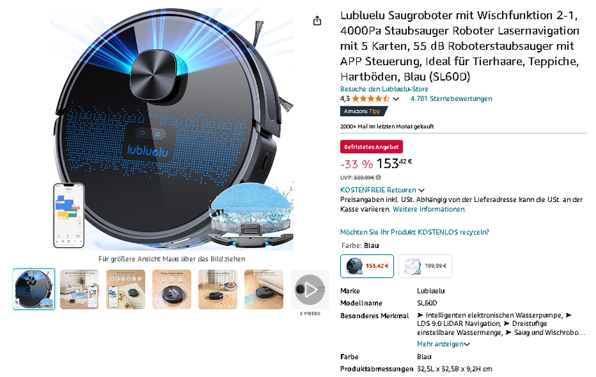 Der innovative Lubluelu SL60D ist momentan für nur 153,42 € statt 229,99 € verfügbar - das entspricht einer Ersparnis von 33%! Eine großartige Gelegenheit für smarte Reinigung.