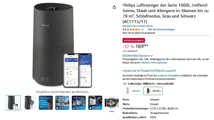 Der fortschrittliche Luftreiniger ist aktuell für 169,00 € statt 249,99 € erhältlich - das bedeutet eine Ersparnis von 32%! Eine Investition in gesündere Raumluft.