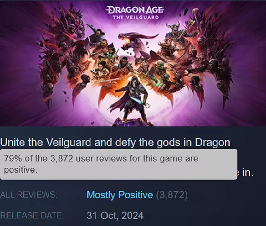 Im Moment hat Dragon Age: The Veilguard 79% positives Feedback mit 3872 Bewertungen.