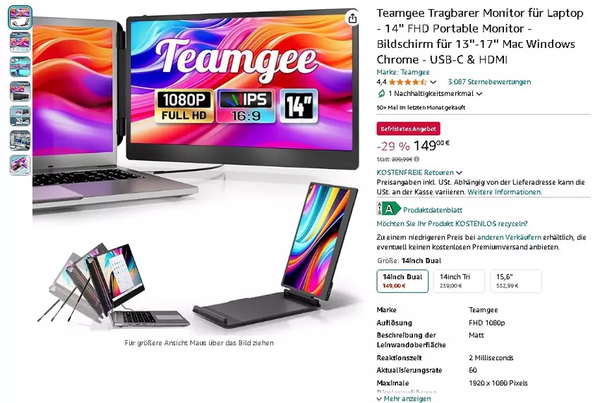 Ein außergewöhnliches Angebot erwartet Sie: Der Teamgee 14-Zoll tragbare Monitor ist jetzt zu einem verlockenden Preis erhältlich. Dieser vielseitige Zweitbildschirm verbindet Mobilität mit beeindruckender Bildqualität.