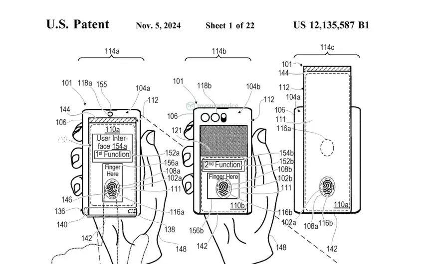 Das Patent beschreibt, wie das Authentifizierungssystem in einen beweglichen Bildschirm integriert werden kann, so dass die Nutzer nicht nur die Größe des Displays ändern können, sondern auch das Telefon bequem von jeder Stelle des Bildschirms aus entsperren können.