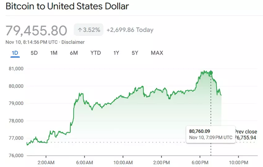 Heute (10. November) hat der Preis von Bitcoin zum ersten Mal die Marke von 80.000 Dollar überschritten und wächst weiter. Der Bitcoin-Preis stieg um 6 % auf 80.948,66 $, bevor er wieder leicht zurückging.