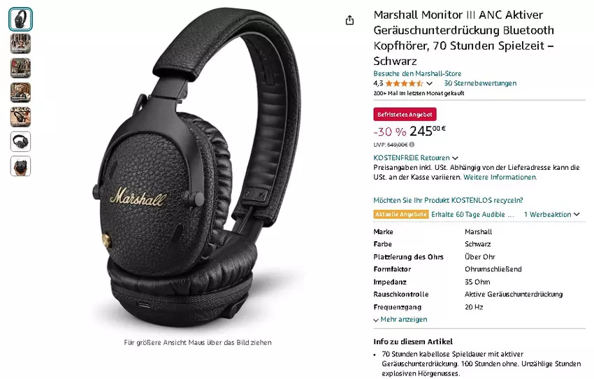 Marshall Monitor III ANC Kopfhörer – Satte 104€ Rabatt bei Amazon!