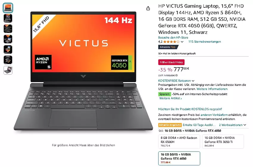 Der HP VICTUS Gaming Laptop ist momentan für 777,00 € statt 1.199,00 € erhältlich - ein beeindruckender Rabatt von 35%!