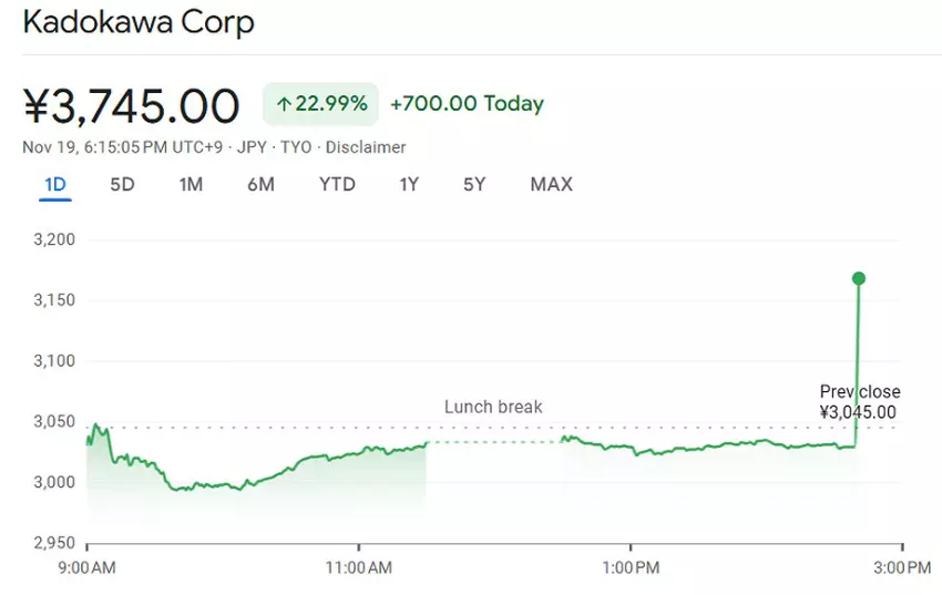 Es lässt sich noch nicht sagen, inwieweit diese Nachricht der Realität entspricht, aber die Aktienmärkte reagierten sofort darauf, und der Wert der Kadokawa-Aktien an der Tokioter Börse stieg um 23 % und erreichte einen Rekord.