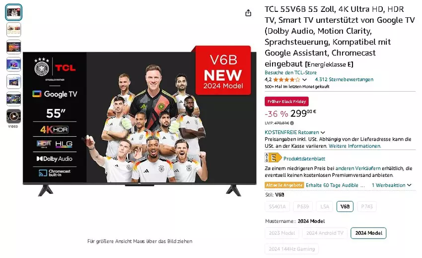 Der TCL 55V6B 4K Smart TV ist aktuell für 299,00 € statt 470,81 € erhältlich - eine Ersparnis von 36%! Ein bemerkenswertes Angebot für einen Fernseher dieser Klasse.