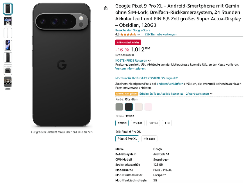 Das Google Pixel 9 Pro XL ist aktuell für 1.012,18 € statt 1.199,00 € verfügbar - eine Ersparnis von 16%. Eine beachtliche Preisreduktion für dieses Premium-Smartphone.