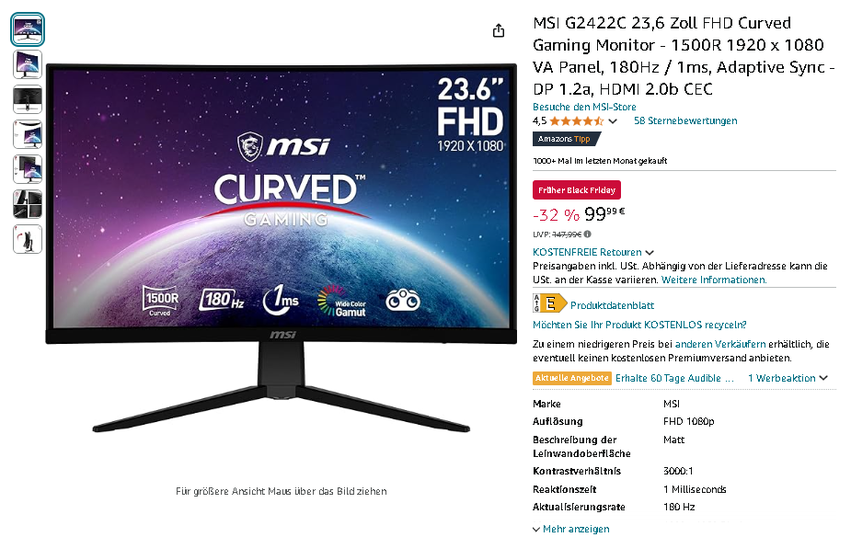 Mit seiner Gaming-optimierten Ausstattung, dem curved Display und dem aktuellen Sonderpreis ist der MSI G2422C eine überzeugende Wahl für alle, die einen leistungsstarken Gaming-Monitor suchen.