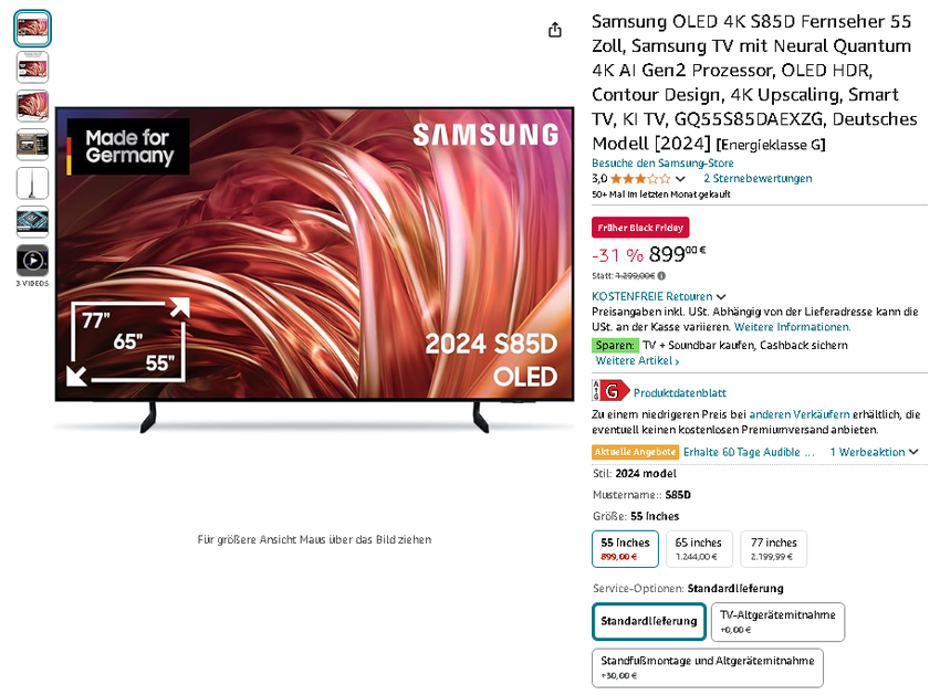 Der Samsung S85D ist aktuell für 899,00 € statt 1.299,00 € erhältlich - ein großzügiger Rabatt von 31%. Ein Traumpreis für Premium-Bildqualität.