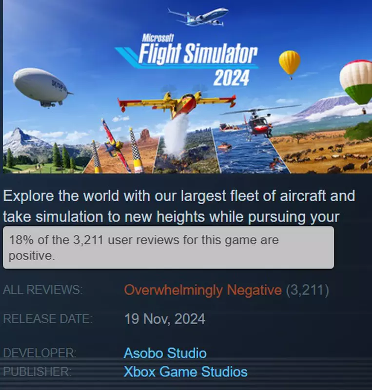 Steam-Nutzer haben den Microsoft Flight Simulator 2024 kritisiert. Das Spiel erhält "extrem negative" Bewertungen, und nur 18 % der Spieler waren mit dem Spiel zufrieden.