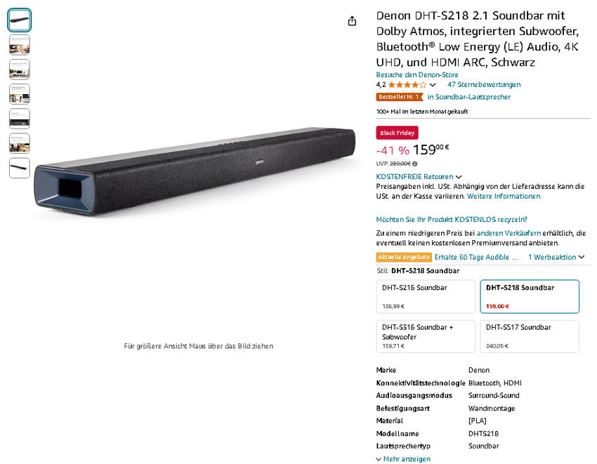 Die Denon DHT-S218 ist aktuell für 159,00€ statt 269,00€ erhältlich - das bedeutet eine Ersparnis von 41%!
