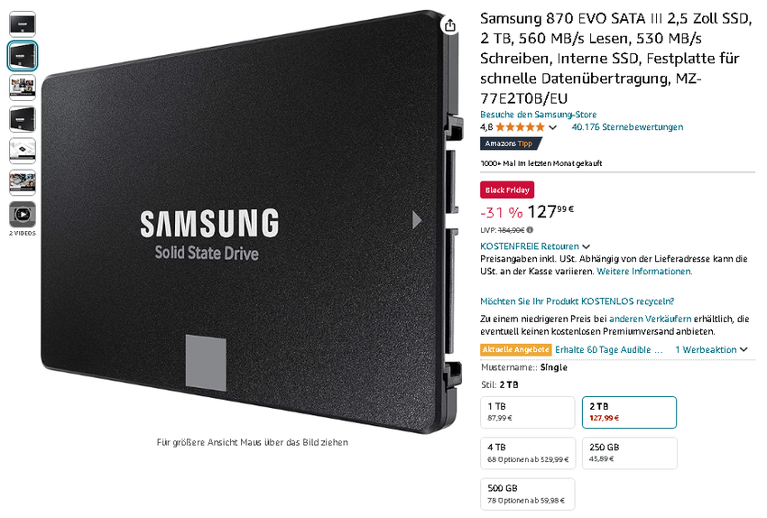 Sichern Sie sich die Samsung 870 EVO zu einem verlockenden Preis auf Amazon.de