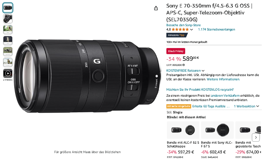 Eine außergewöhnliche Gelegenheit für Foto-Enthusiasten: Das professionelle Sony E 70-350mm f/4.5-6.3 G OSS Telezoom-Objektiv ist bei Amazon zu einem bemerkenswerten Sonderpreis erhältlich. Dieses vielseitige G-Objektiv vereint erstklassige Optik mit kompakter Bauweise.